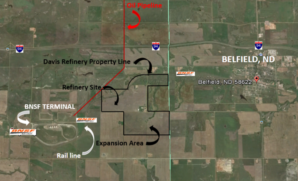 The company is Meridian Energy Group and they are building the Davis Refinery in the Bakken oil field outside of Belfield, North Dakota, next to the major trucking artery Highway 85.  (Side bar, Highway 85 is so important to the future of the United States, there was a successful lobbying effort to name it the Theodore Roosevelt Expressway.  Humanized Highways are generally funded well.)