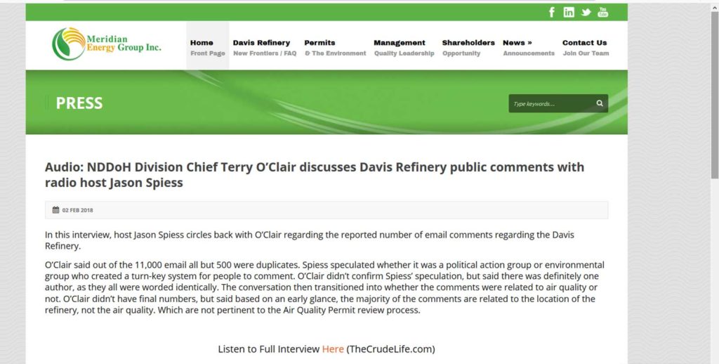 Since 2015, I’ve had regular conversations with William Prentice, CEO, Meridian Energy Group regarding the Davis Refinery and their behind-the-scenes battles.  In fact, for several years we did a daily update on The Crude Life Week In Review newsmagazine radio program, which aired across all the counties the Davis Refinery is being built in.