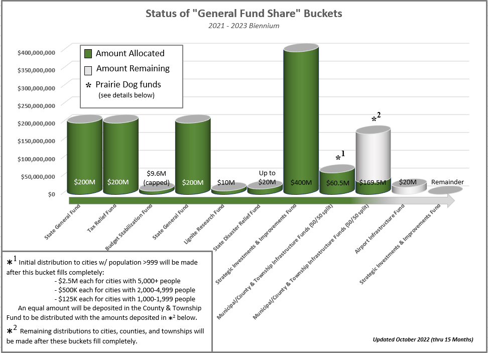 Remaining funds will be distributed when the second pair of buckets fills. City allocations are based on population, population growth and valuation of taxable property. County payouts are based on the road and bridge needs study produced by the Upper Great Plains Transportation Institute.